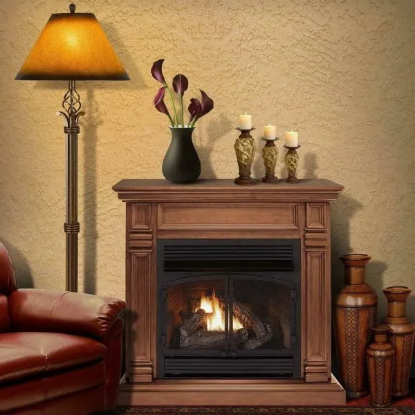 Duluth Forge Dual Fuel Ventless Gas Fireplace With Mantel – 32,000 BTU, T-Stat Control, Toasted Almond Finish – Model# DFS-400T-2TA