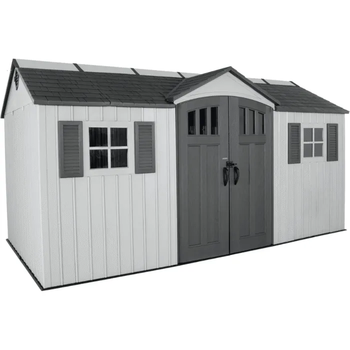 The Lifetime Dual Entry 15 ft. x 8 ft. Outdoor Shed is designed for ease of use, durability, and low maintenance, making it an ideal long-term storage solution for outdoor essentials. With a high-pitched roof for efficient drainage and a Double Wall System constructed from high-density polyethylene (HDPE) panels reinforced with steel, this shed provides strength, stability, and resistance to harsh weather conditions.