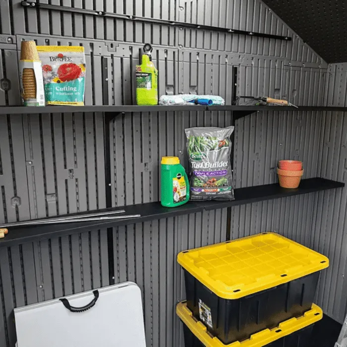- Customizable shelving system allows for organized storage, making it easy to arrange tools, equipment, and seasonal items.