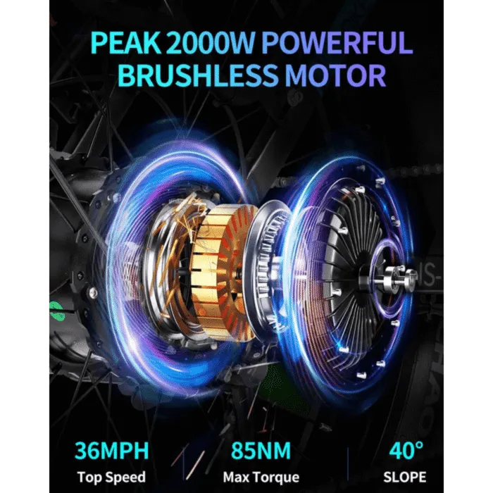 - Powerful 2000W Motor: Conquer demanding terrains with a high-torque motor that makes steep slopes (up to 45°) and rough trails feel effortless.